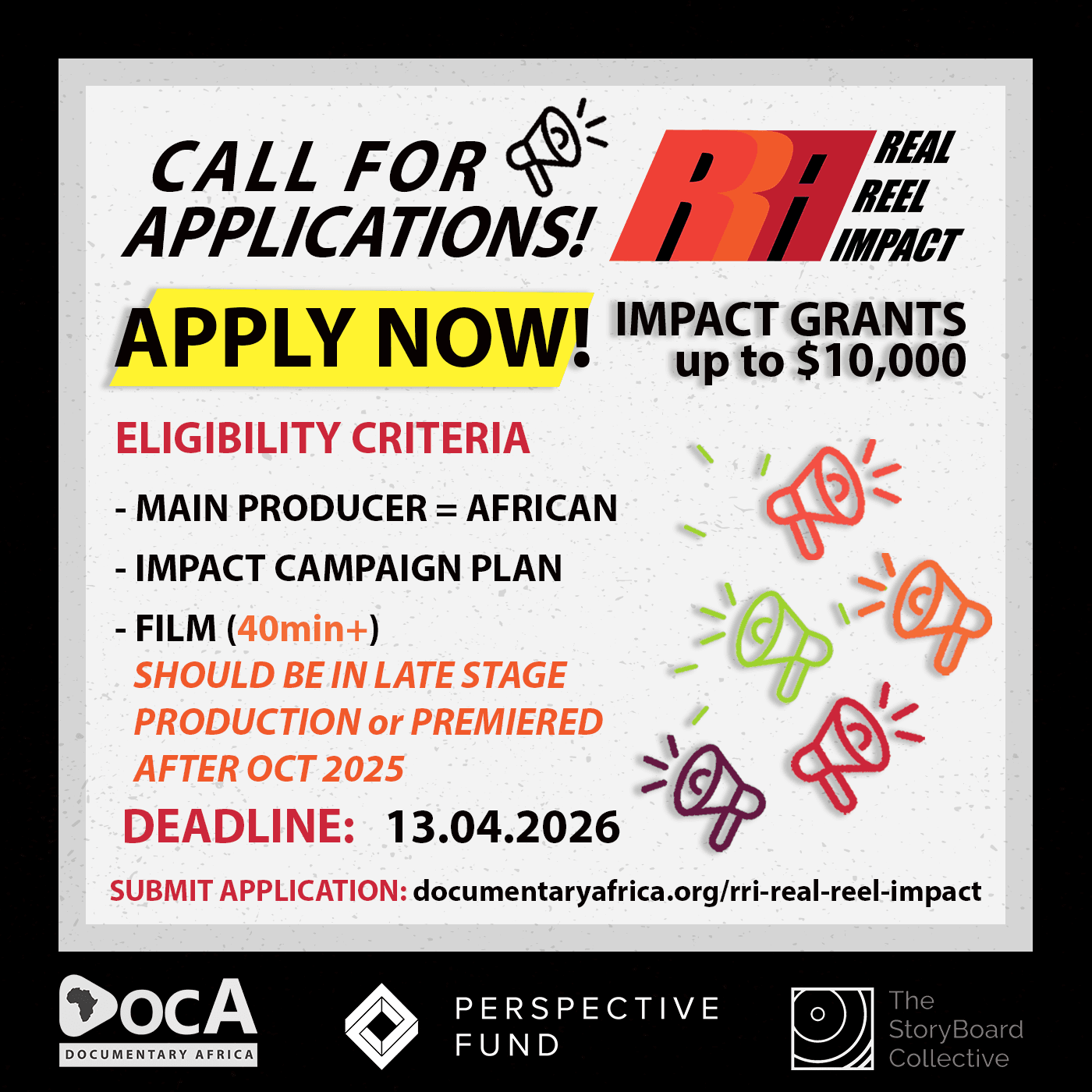 Startup grants of up to USD 10,000 for African documentary projects with urgent, high-impact campaign goals. Supports filmmakers ready to launch strategic impact campaigns that use documentary storytelling to drive social engagement, advocacy, and change.