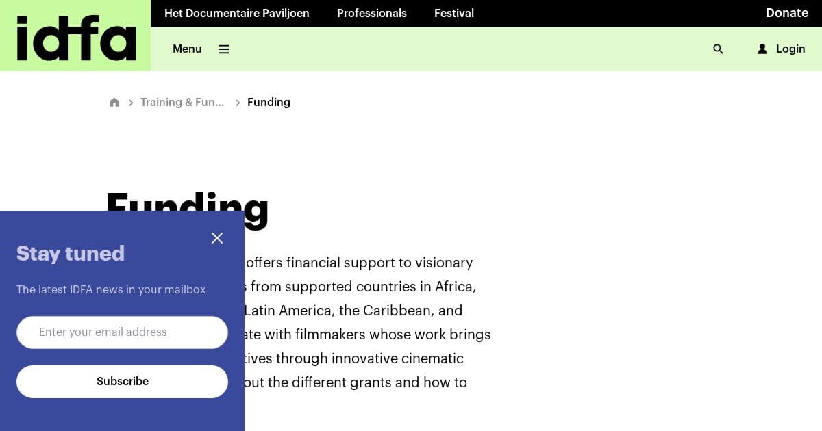 The IDFA Bertha Fund is run by IDFA — the International Documentary Film Festival Amsterdam, the world's largest documentary festival. It is the only fund in the world dedicated solely to stimulating documentary filmmaking in Africa, Asia, Eastern Europe, Latin America, the Caribbean, and Oceania. Funded by the Bertha Foundation (UK-based philanthropic organisation), it was established in 1996 and has been one of the most important documentary funding mechanisms for African filmmakers for nearly 30 years. IBF-backed films have been shortlisted for the Oscars and BAFTA and have premiered at Cannes, IDFA, Berlin, and major festivals worldwide. African filmmakers apply directly — no European partner required for the Classic grant.