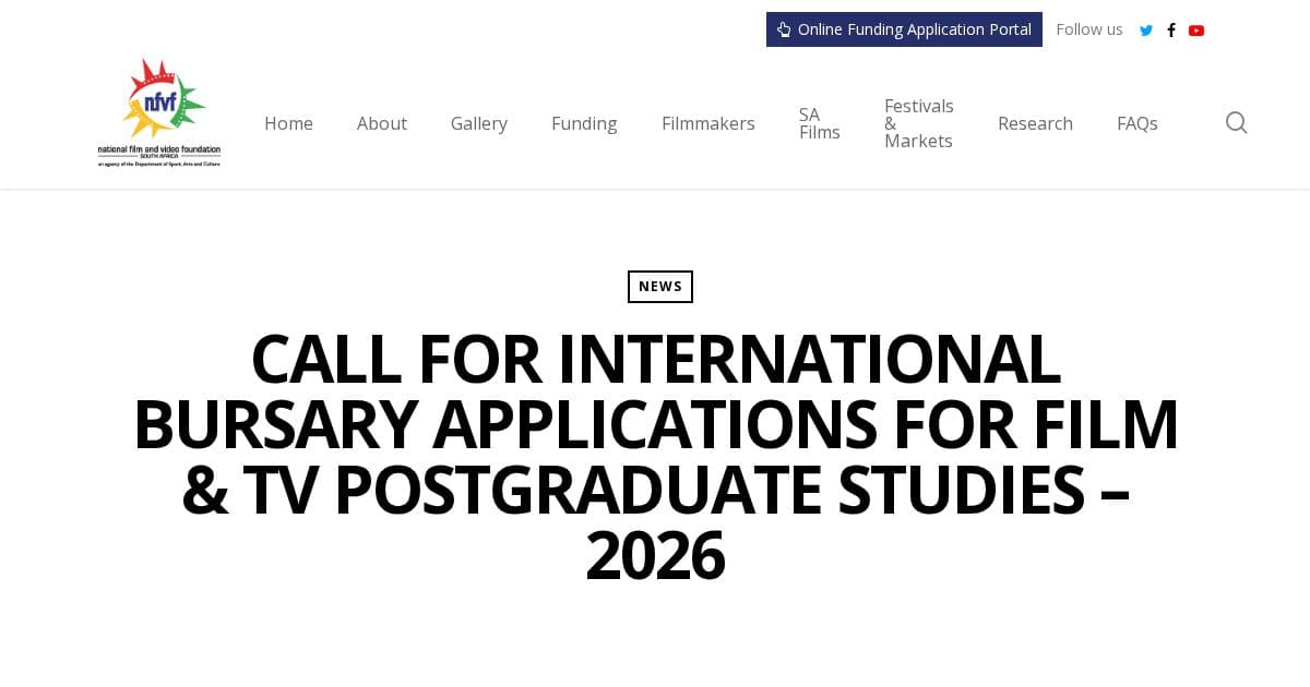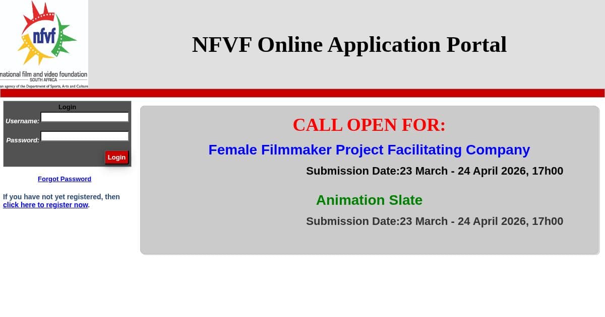 Financial support for South African filmmakers and industry practitioners to attend film festivals and markets taking place 8–31 May 2026. Funded by the National Film and Video Foundation (NFVF). [Enriched 2026-04-21] NFVF call for South African filmmakers to apply for funding to attend international and local film festivals/markets running 08–31 May 2026. Up to R50,000 for international travel, up to R20,000 for local attendance.