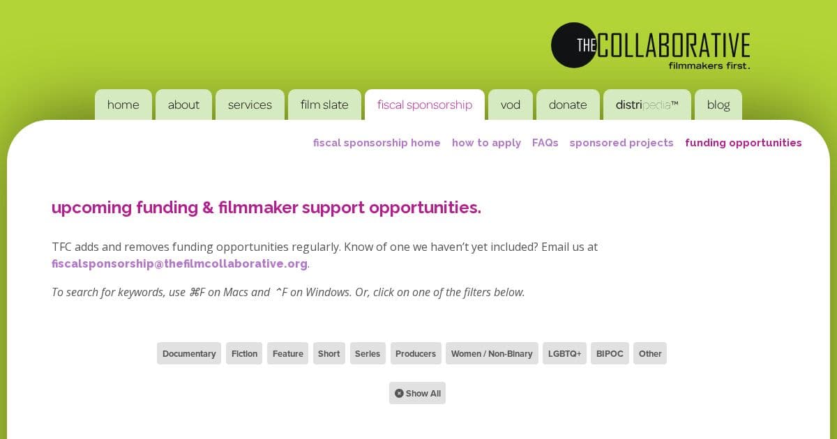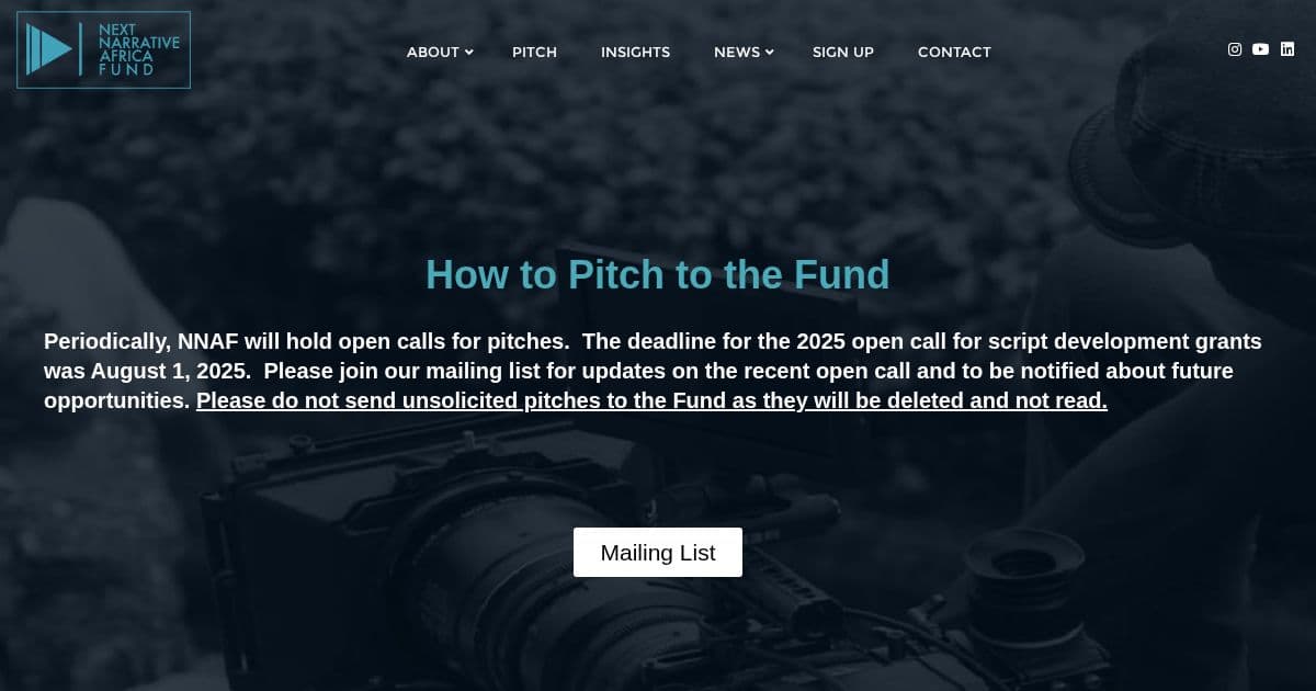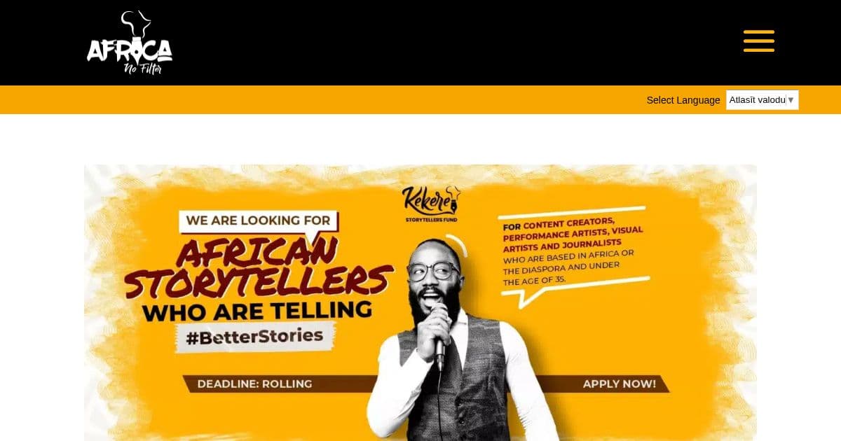 Africa No Filter is a donor collaborative focused on shifting stereotypical narratives about Africa. Its Kekere Storytellers Fund provides micro-grants to emerging African content creators whose work tells African stories beyond stereotypes of poverty, conflict, disease, poor leadership, and corruption. Supports short films (up to $5,000), feature films (up to $10,000), documentaries, digital storytelling, and youth-led content.