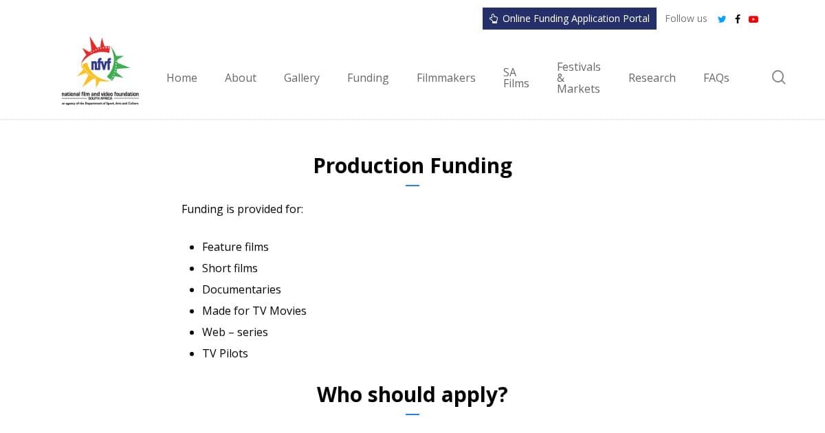 The National Film and Video Foundation (NFVF), an agency of the Department of Sport, Arts and Culture, is mandated to ensure the equitable growth of the South African film and video industry. The NFVF fulfils this mandate by providing funding for the development, production, marketing, and distribution of films, as well as the training and development of filmmakers. In addition, the NFVF commissions research and produces industry statistics that provide valuable insights into the South African film industry for both the public and stakeholders. In line with this mandate, the NFVF invites eligi