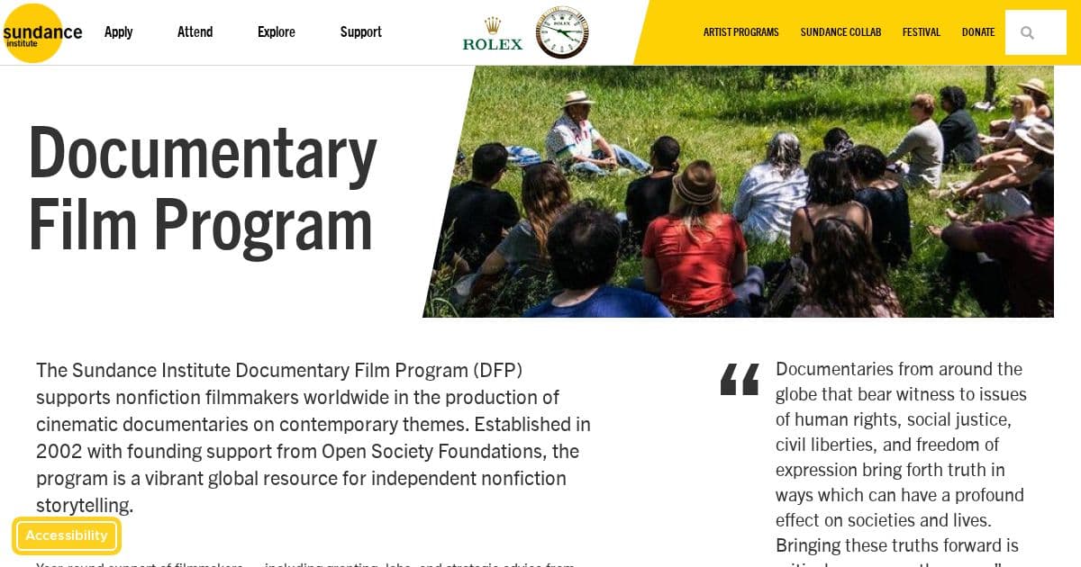 The Sundance Institute Documentary Film Program, established in 2002 with founding support from the Open Society Foundations, supports nonfiction filmmakers worldwide in the production of cinematic documentaries on contemporary themes. Grants of $15,000 to $50,000 for documentary projects at development, production, and post-production stages. This is separate from the Sundance Screenwriters Lab and Episodic Lab. In September 2025, 32 grantees were announced. At Sundance 2026, African filmmakers Olive Nwosu (Nigeria), Bea Wangondu (Kenya), and Praise Odigie Paige (Nigeria) participated prominently.